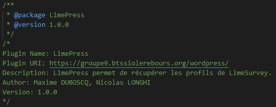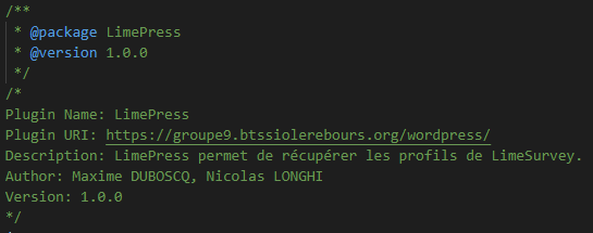 Dans ce dossier, il faut créer un fichier PHP qui contient des commentaires de manière structuré. Ces commentaires doivent par exemple contenir le nom du plugin, sa description, sa version, etc.