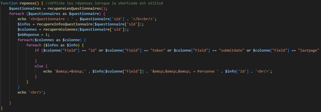 Après analyse de la base de donnée et la manière dont sont stockées les données de Limesurvey, nous avons créé un plugin WordPress en PHP qui récupère les réponses aux questions de manière ciblée.