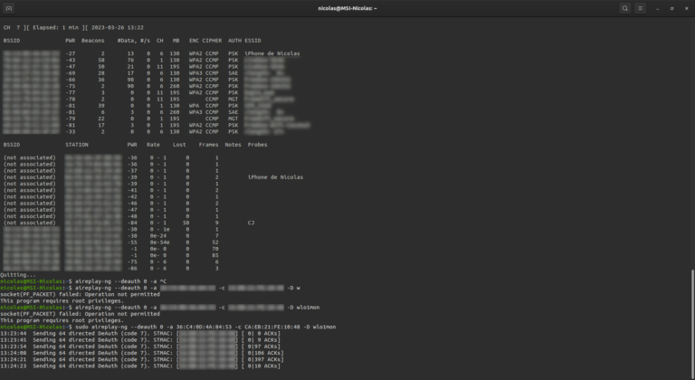 Suite à cela, l’attaque commence en envoyant des paquets de déauthentification à l’appareil. Notre ordinateur attaquant se fait alors passer pour le routeur. Voici un exemple d’attaque en cours ci-dessous.