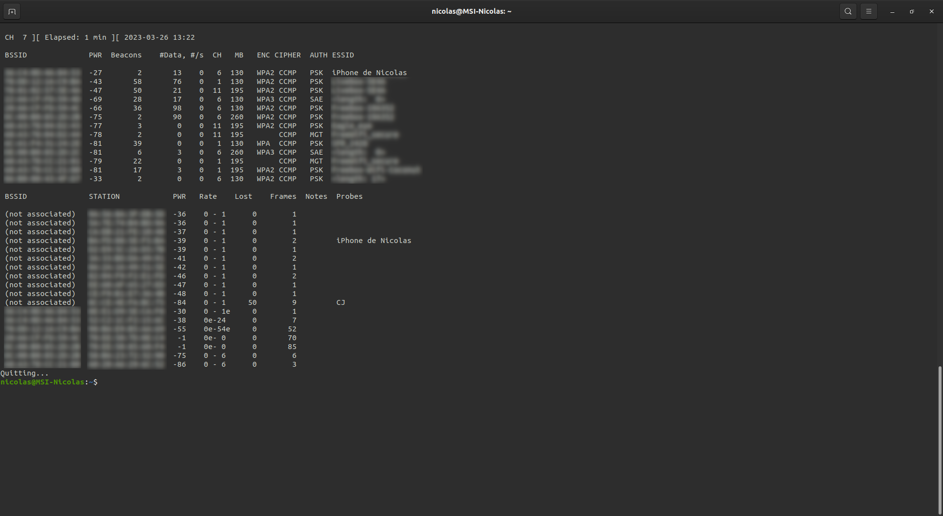 Après cela, nous pouvons démarrer l’analyse des réseaux Wifi depuis aircrack-ng. La commande à taper est :