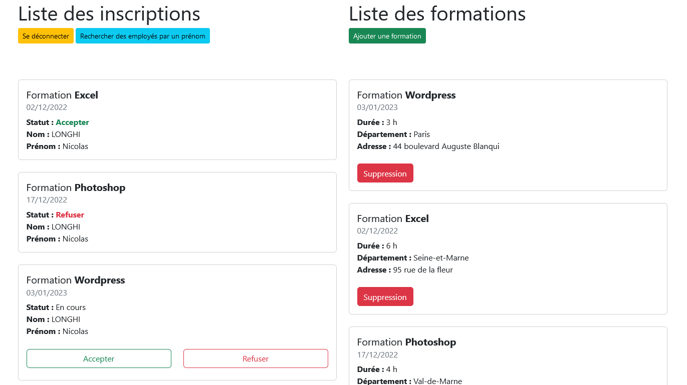 Dans le cadre de ma seconde année de BTS, j’avais pour projet la création d’un site avec le framework Symfony. Le site est destiné aux entreprises et doit intégrer une interface pour les employés (s’inscrire à des formations) et une interface pour la DRH (accepter ou refuser les inscriptions et ajouter des formations).